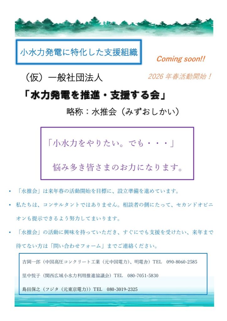 私たち水推会(一般社団法人「水力発電を推進・支援する会」)は、地域に寄り添い、小水力発電の開発を専門的視点から支援することにより、地域のための小水力発電の普及促進を図ることを目的とする新しい組織です。